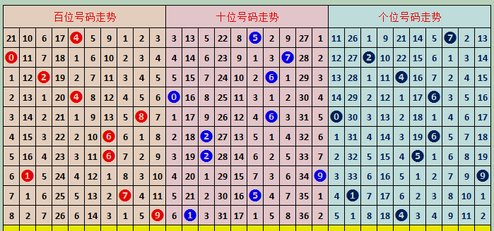 跨度:近10期平均跨度5.8,上期跨度8,与前一期比拟高潮,近10期最大跨度为8,最小跨度为3;本期预测跨度较上期下跌,温雅跨度4。